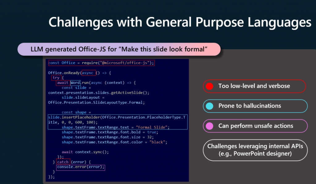 »Ahora, cuando comenzamos a hablar de esto, mucha gente salta inmediatamente a la idea de que probablemente la forma en que hacemos esto es mediante el uso de un lenguaje de propósito general como Office-JS y pidiendo al LLM que nos cree código en ese lenguaje. Pero esto presenta una serie de problemas. Primero, el lenguaje es demasiado detallado. Es muy verboso en lo que crea, y es difícil para nosotros manipularlo y validar lo que crea. En segundo lugar, sabemos que los LLM son propensos a la alucinación, y esto se convierte en un problema cuando el código parece correcto, pero rápidamente se encuentra que está equivocado. Abre mucha superficie. Office-JS y otros lenguajes nativos son realmente potentes y hay algunas cosas que no queremos que el LLM haga dentro de la aplicación en este momento.