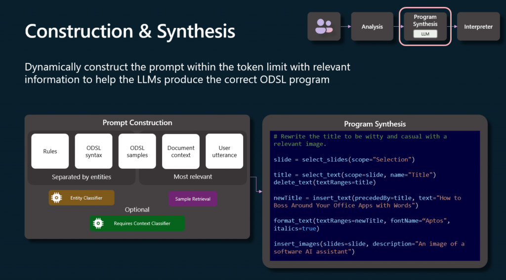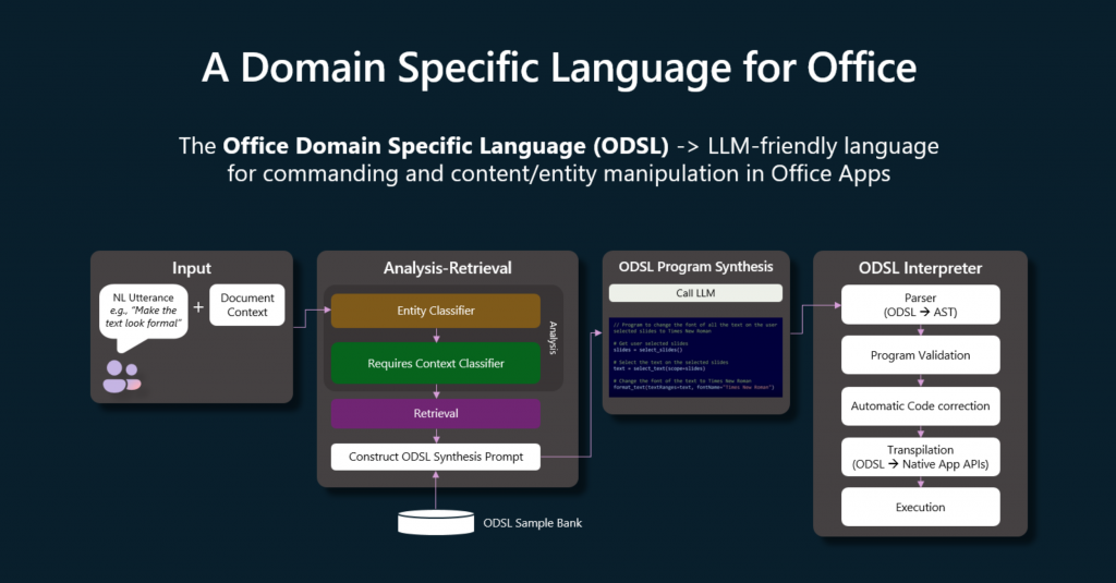 »Finalmente, sí necesitamos poder detectar y recuperarnos. Dado que no tenemos un grupo activo de desarrolladores desarrollando esto, necesitamos encontrar problemas y solucionarlos antes de ejecutar el código. La síntesis de programas es el método que usamos para hacer esto. El LLM se abstrae del código en sí mismo y luego usamos la transpilación para terminar generando el código y ejecutándolo en el cliente. Para nosotros, hemos creado un DSL, un lenguaje específico del dominio, que llamamos ODSL, o el lenguaje específico del dominio de Office para hacer esto.