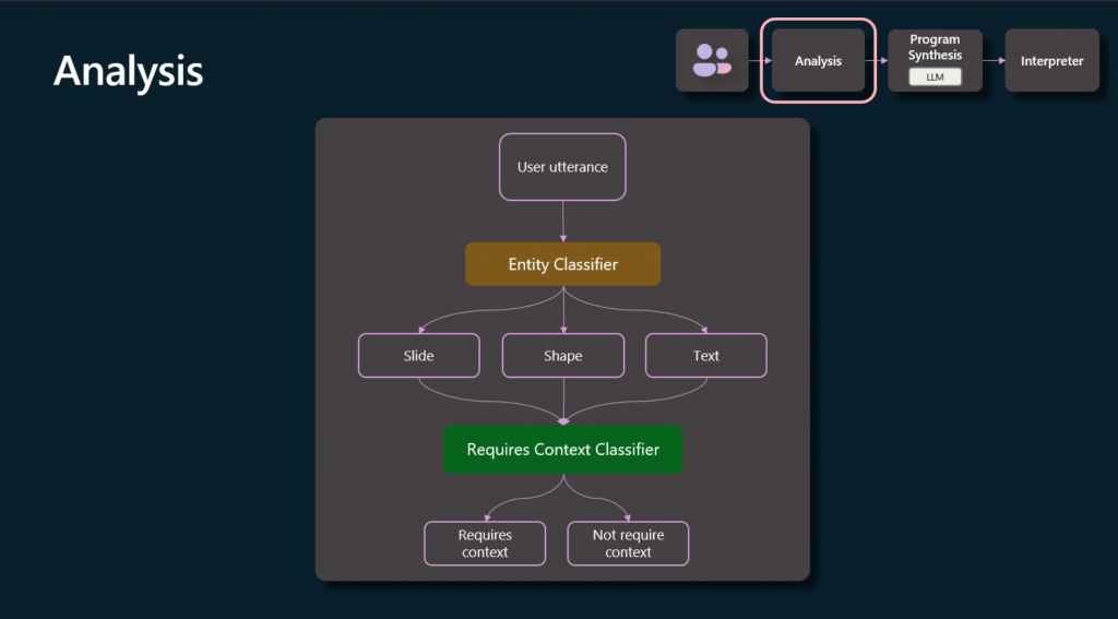 »Primero, hacemos una clasificación de entidades. Queremos entender qué tipos de entidades vamos a necesitar interactuar, ya sea para realizar cambios o para generar el contenido en sí mismo, y queremos determinar cuán relevante es el contexto del documento en sí. Vimos eso en algunos de los ejemplos anteriores. La diapositiva que creé, por ejemplo, no requería ningún contexto del documento, pero la manipulación posterior de una diapositiva que ya tenía, sí lo hacía.
